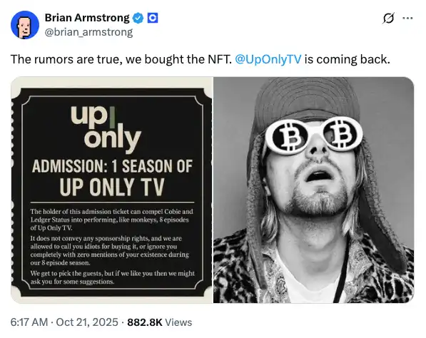 同一时间,Coinbase CEO Brian Armstrong 在社交媒体上确认:「传言是真的,我们买了这个 NFT。UpOnly 节目要回归了。」