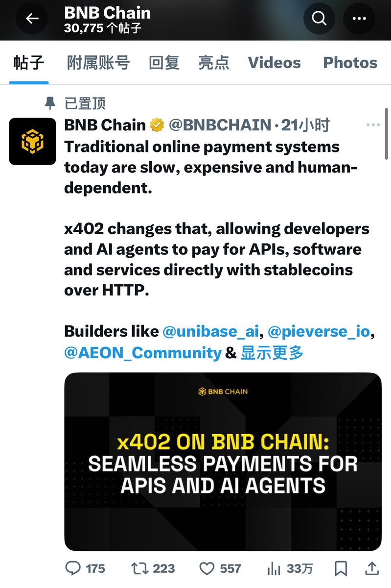 在置顶帖里,BNB Chain 官方点名了 4 个 BNB 生态的 x402 项目。剔除已 TGE 的后,只剩下 pieverse 、AEON 和 TermiX AI 。