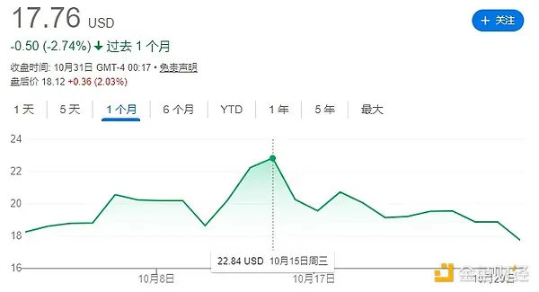 10月8日,COIN达到月内高点387.27美元,但1011暴跌之后,COIN也随之下跌,截至发稿报328.51美元,较之月内高点下跌15.17%,与BTC的13%跌幅较为相近。