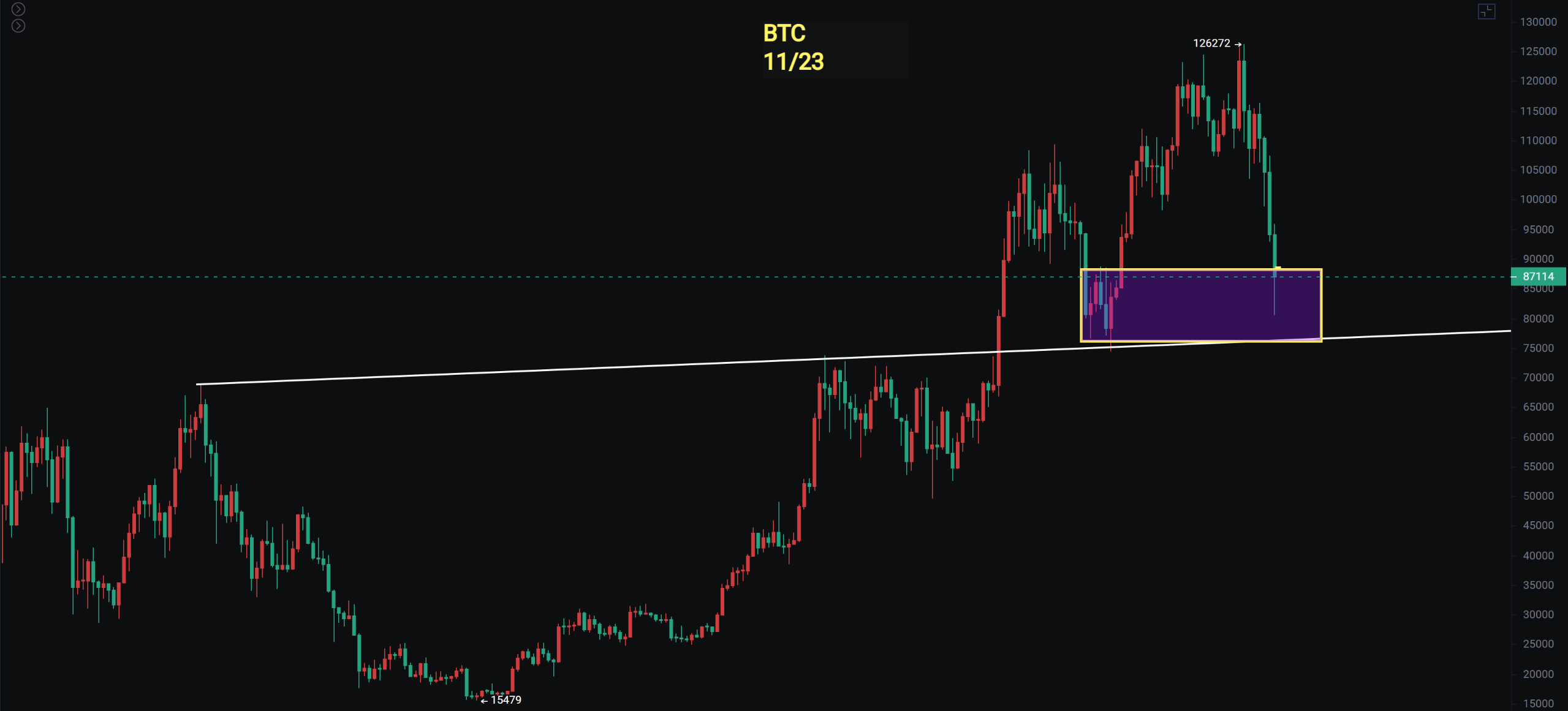 大饼周线即将收线,最低插针80600。再往下的支撑是74500附近,这里是强支撑。日线暂时无法判断是否已完全触底,但正接近反弹区间。周线在考验M头的支撑,正常情况下这里不会一次性跌破。12月份降息的概率为71%,还有半个月左右的时间,这也是利好。另外,从19年、20年到目前为止,每年的春节行情我们都有把握,即“春节红包行情”。因此,我们也同样认为今年大概率会有春节行情,也就是接下来的一波反弹行情。