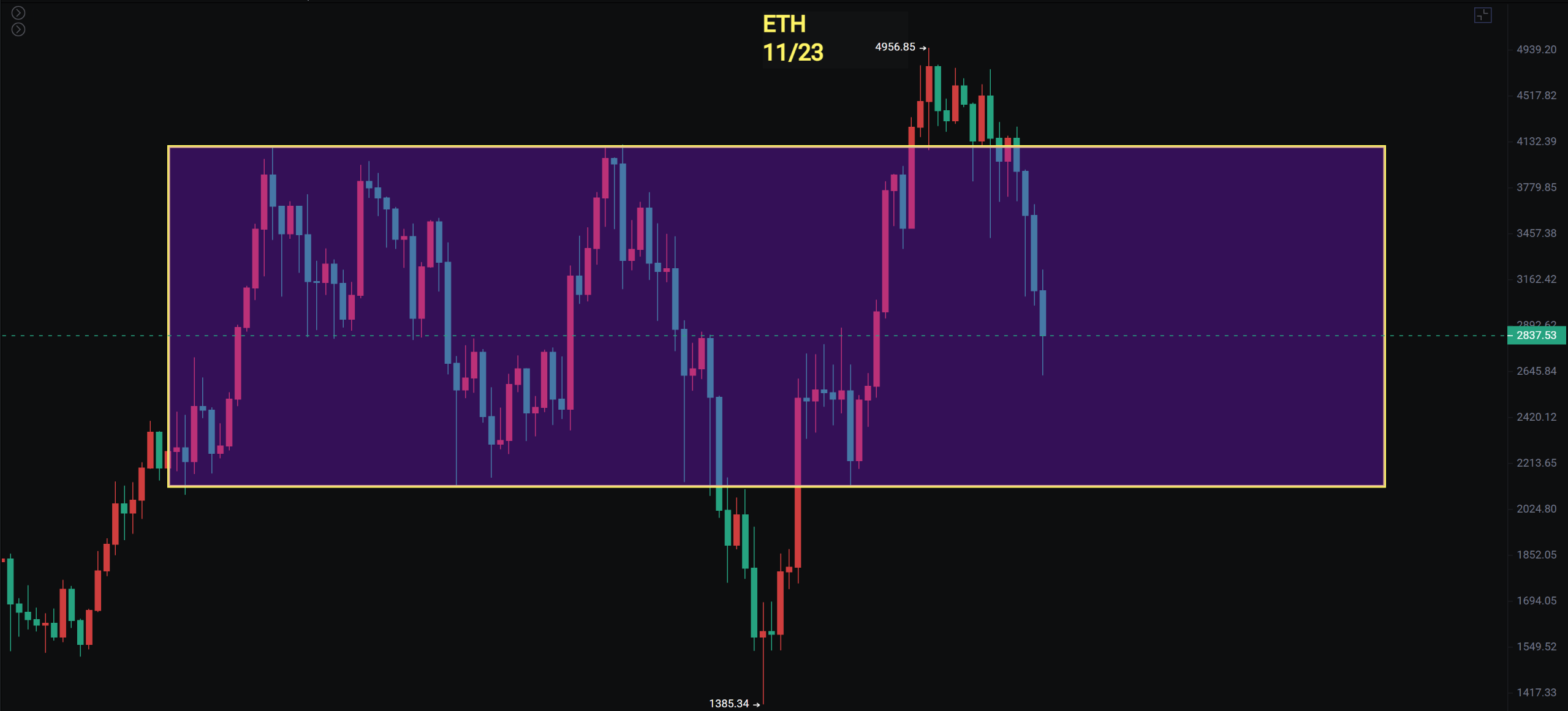以太自MACD下穿零轴之后就一直提醒看空。而且周线之前也收了两组“双阳夹阴”,目前已经跌至斐波那契0.618附近并插针。月线虽然也出现顶背离,但情况比大饼稍好一些。日线跌至2300-2800箱体上沿支撑,现货仍可分批布局,止损2623,但合约只能做超短线反弹。更多关注山寨币反弹机会。