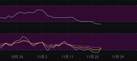 Mfi和rsi上看,目前mfi还在超卖区域,不过rsi已经脱离了超卖区域。昨天我们讲到要想止跌就需要把指标拉出超卖区域,目前看多军正在向着这方面努力,我们看能不能持续。