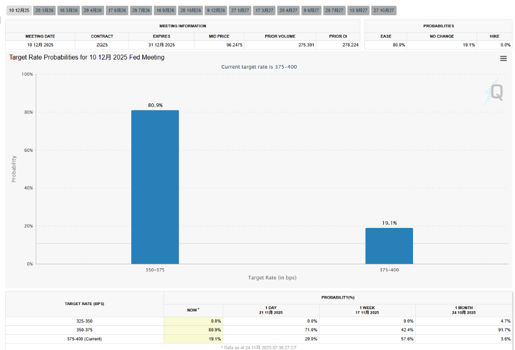 ● 根据CME“美联储观察”工具数据显示,美联储12月降息25个基点的概率已飙升至82.9%,而前一天这一概率仅为69.4%。