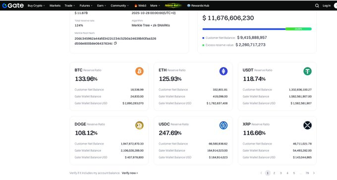 截至10月28日,Gate.io报告的总储备价值为116.76亿美元,储备率124% 。