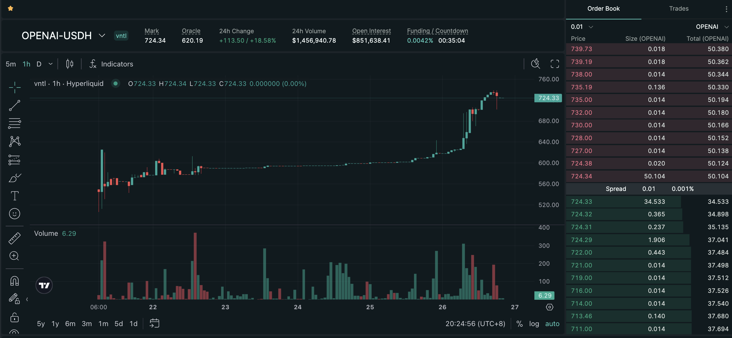 就在上周,Hyperliquid 直接上线了OPENAI-USDH 交易对。这意味着一家尚未上市、估值完全由私募市场主导的公司,被拉进了一个 7×24、可加杠杆、全球可访问的链上市场,形成了对 Pre-IPO RWA 的降维打击。