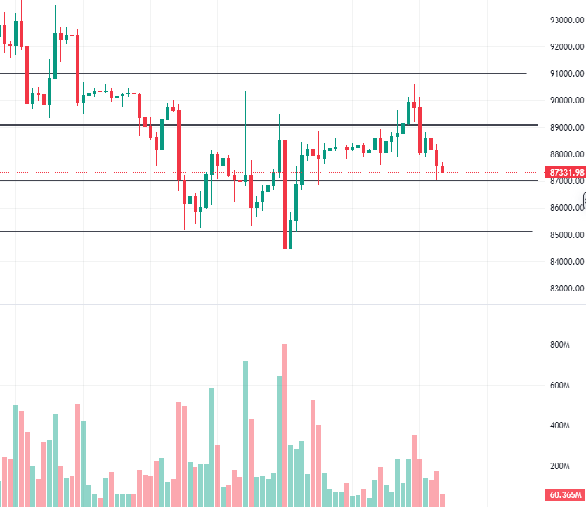 周一比特币日内反弹上涨,昨晚美盘前最高到90600附近,以太坊昨日上午反弹突破3000关口后日内震荡慢涨晚间最高到3080附近。美盘开始后价格出现剧烈波动并回落走低,今天凌晨扩大跌幅,比特币下探87800,以太跌至2960,抹平日内涨幅。