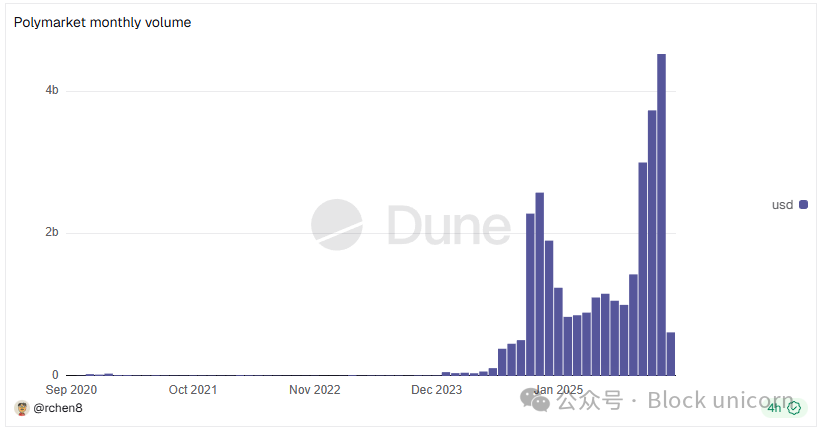 我记得在 2024 年美国总统大选前的最后 45 天里,每天都能看到关于卡玛拉·哈里斯和唐纳德·特朗普之间赔率波动的新闻。Polymarket 和 Kalshi 的名字也频频出现在新闻报道中。2024 年 10 月和 11 月,Polymarket 的月度投注额分别飙升至 23 亿美元和 26 亿美元,均超过了此前累计的投注额。
