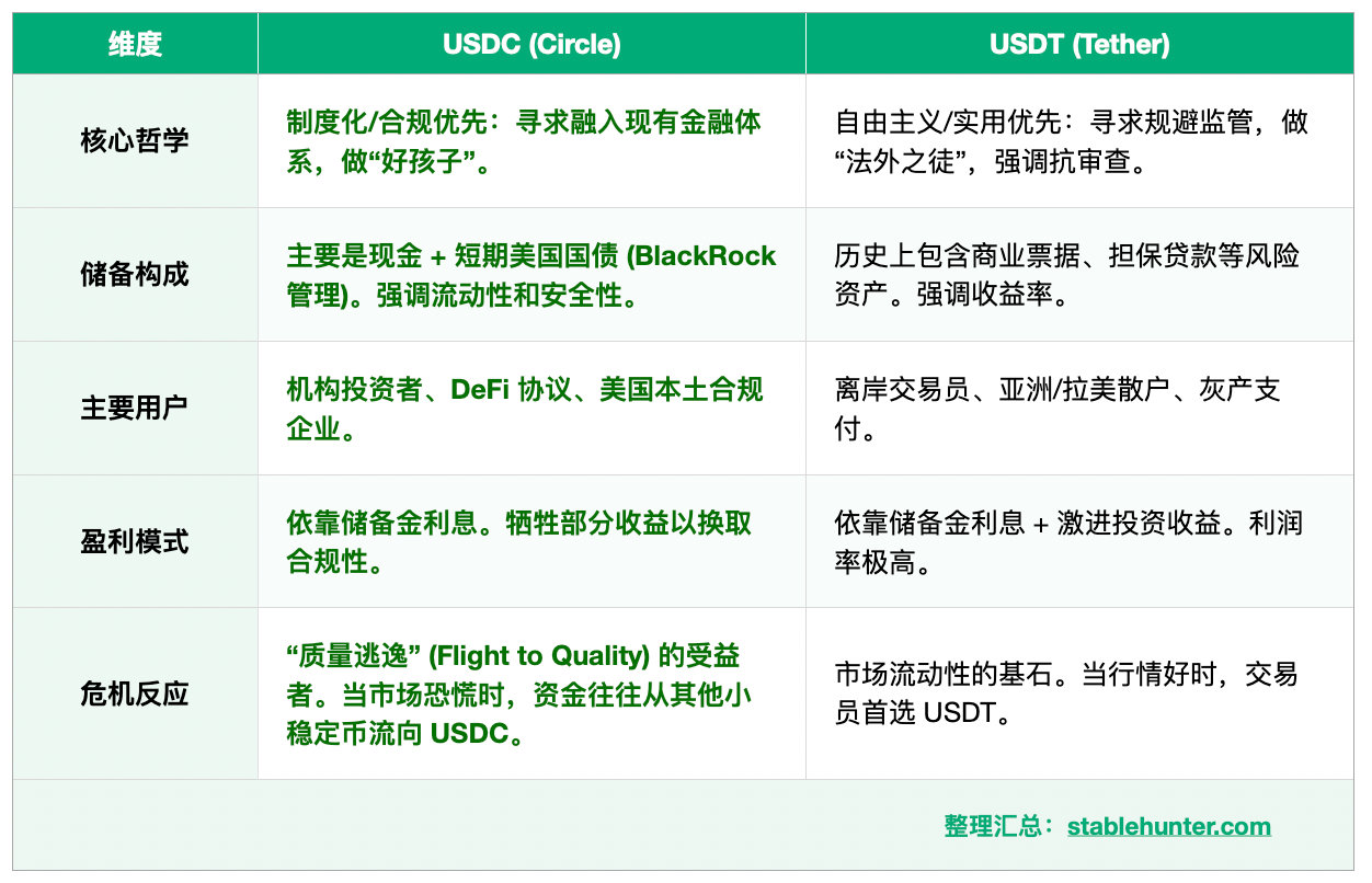 Tether 赢在了「广度」和「速度」,占据了离岸市场和发展中国家的支付渠道;而 Circle 赢在了「深度」和「信誉」,占据了华尔街机构接入加密世界的入口。