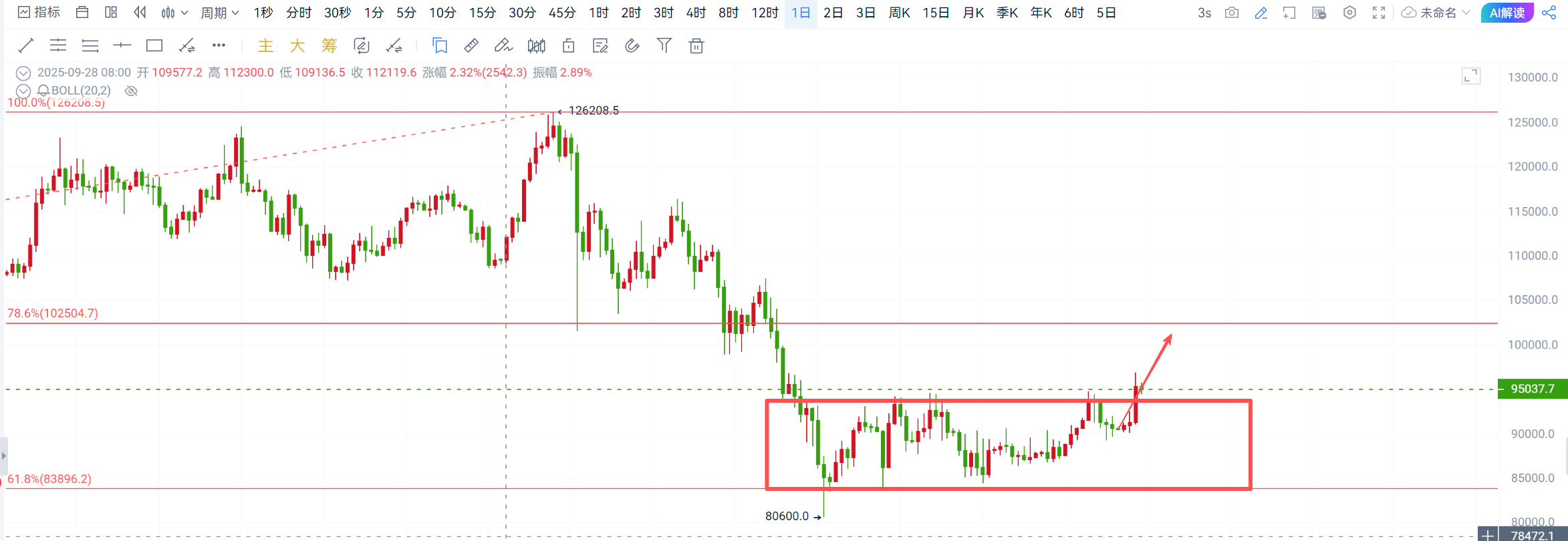 日线级别大饼成功走出预期二次上探趋势并上破箱体结构顶部94500,目前已至95000附近,根据顶底转换前期的箱体结构顶部位置现转换为支撑位,上方压力95500-96500,继续上行则100000有望!以太也是走出预期上行趋势,目前已到箱体结构顶部3320附近,但上破还未走出,支撑暂看3250-3280,压力3320,破位看3400!