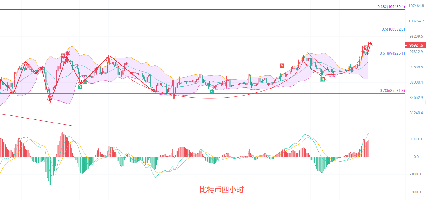 四小时K线的壶嘴形态已经走出来了强势北上的行情,EMA趋势指标同样向上开口扩散,EMA15趋势快线支撑预计会冲破94000的分割线继续上拉,布林带开口扩散,K线围绕上轨97000来回交替上行概率增加,行情短线内进入极端超买,有回调的需求,也就是说还有北上的机会