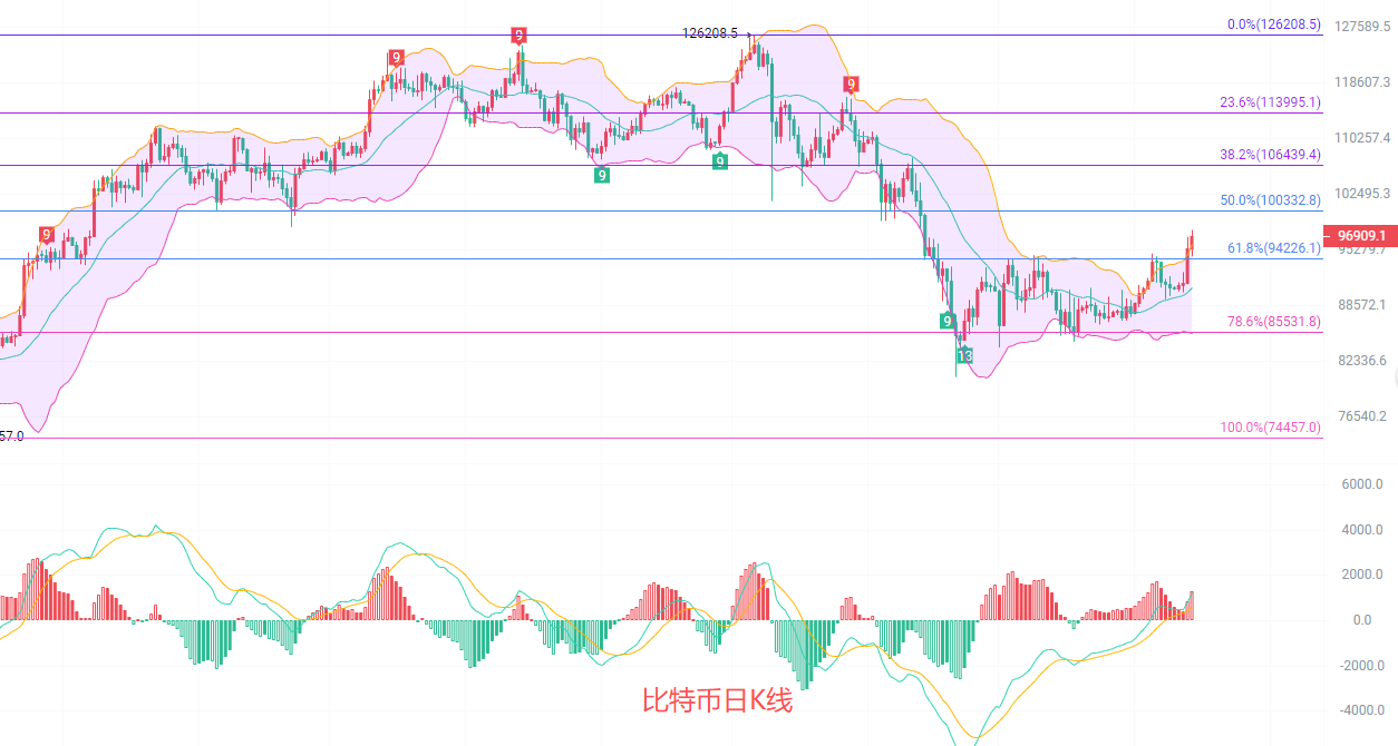 日K线发稿前最高97750,最低94400,也就是说主力直接回踩在黄金分割线0.618一线支撑开始发力的,目前已经破了EMA120趋势顶部97000的阻力,目前在EMA120一线横盘,若主力无法破次压力,大概率会回到94000上方横盘,MACD连续放量增筹,DIF和DEA开启多头模式,布林带上轨95800失守,现在压力变支撑,趋势上回踩支撑北上为主,暂时不考虑南下