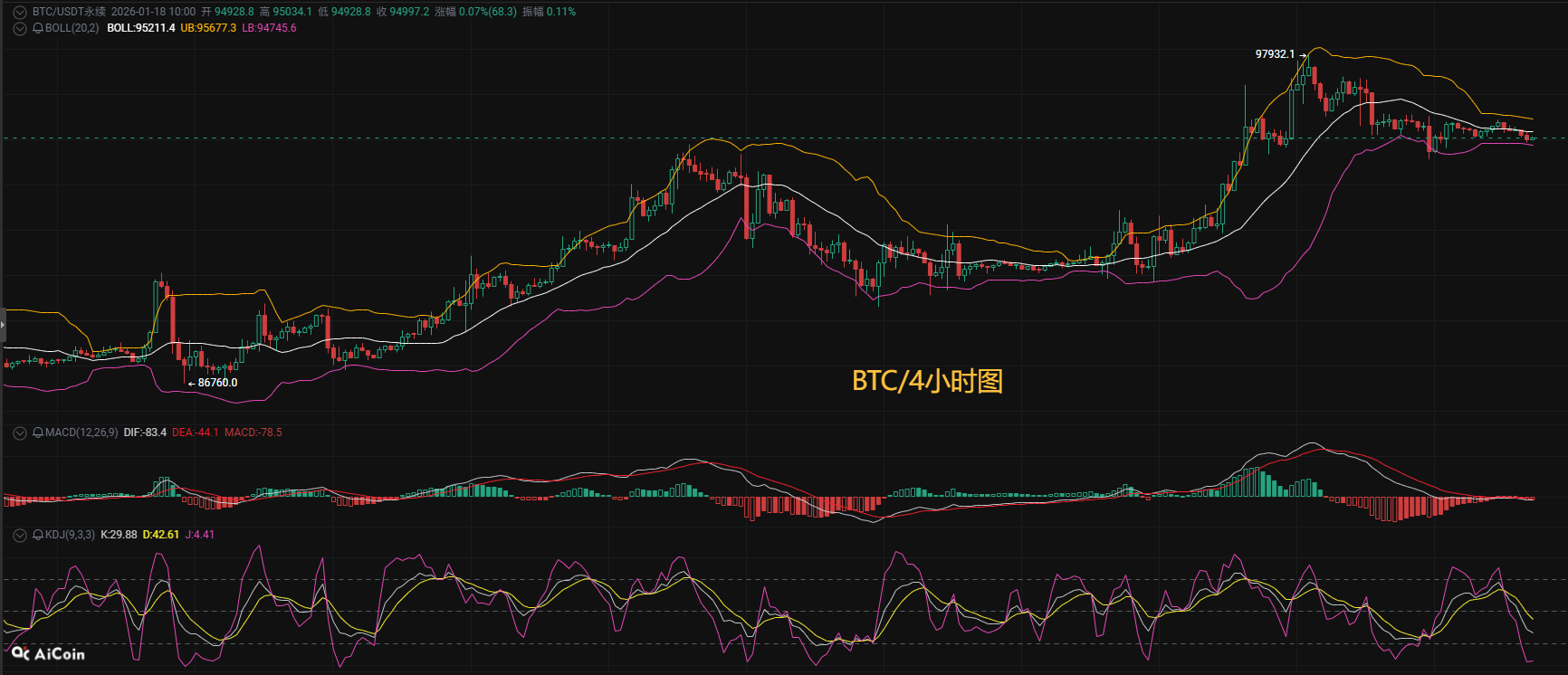 技术指标来看:MACD双线在零轴下方持续走弱,且EMA均线系统(7/30/120)短期走势偏弱。整体需密切关注94000支撑强度其次关注92500附近,若失守则下行空间可能进一步打开。操作上建议高空低多