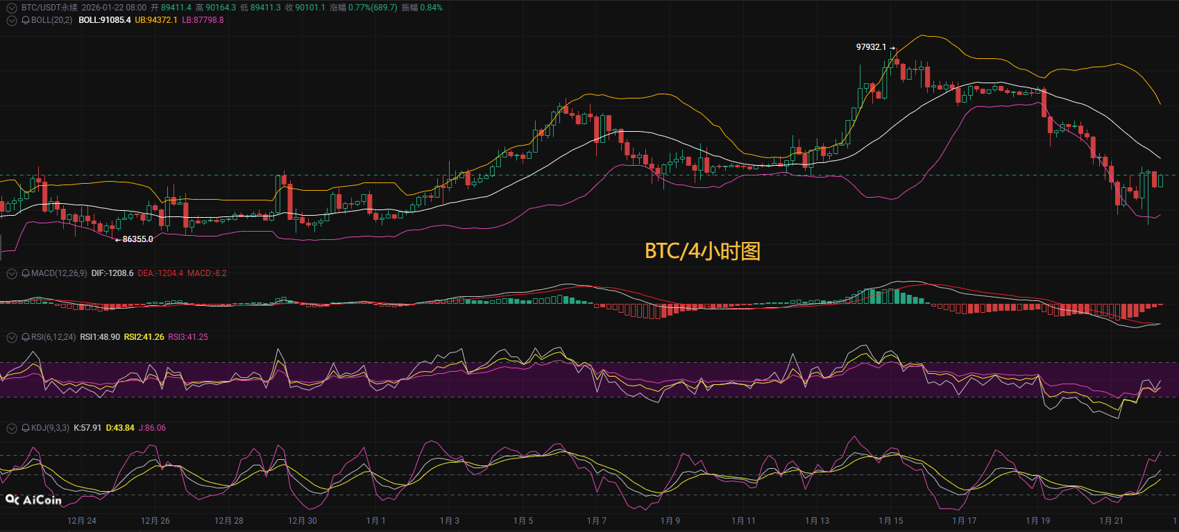 技术指标来看,4小时MACD的DIF与DEA已在零轴下方形成金叉,但日线级别MACD仍处于空头区域,中长期趋势尚未完全扭转。同时,价格当前已突破EMA7(89,914),但仍受到EMA30(91,751)的压制,显示短线虽有反弹动能,但上方仍面临中期均线的关键阻力。整体还是有所偏弱,后续若能企稳90000一线,涨幅才能延续向上试探,反之不能企稳9万一线,后市还有向下试探可能,目前走势处于修复盘整,但是上行趋势未破,所以思路反弹空,回调低多为主,下方支撑破位关注87000、85000,