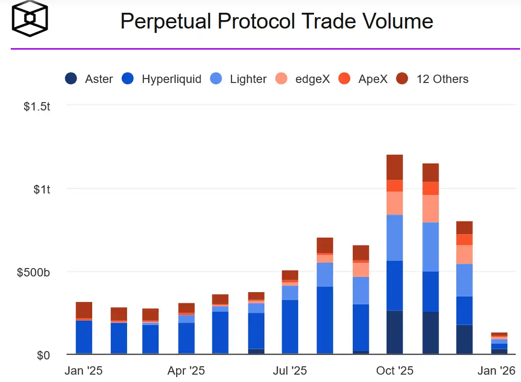 在绝对规模上,行业 TVL 展现出极强的资金沉淀能力,自 10 月峰值后持续企稳于 2300 亿美元上方;交易量层面,自 2025 年下半年起,主流协议月均交易额突破 5000 亿美元,并在 10 月与 11 月的高峰期连续突破 1 万亿美元($1 Trillion)关口,证明链上流动性深度已足以承载机构级资金。