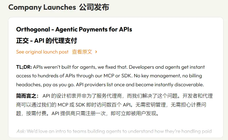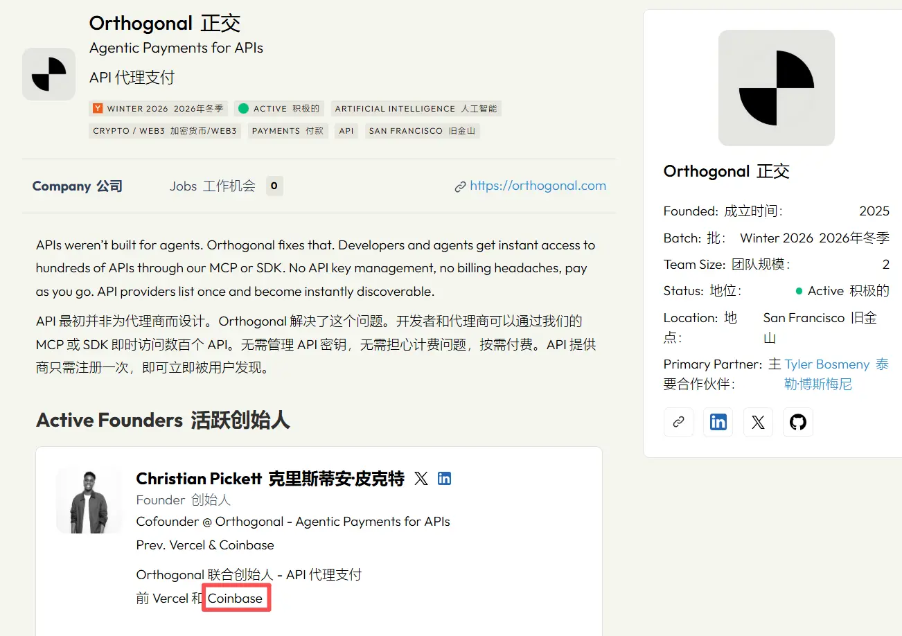 Orthogonal做了一个统一网关:Agent通过MCP或SDK接入,即时访问数百个付费API,按请求付费,不需要管理API key,不需要建立计费关系。API提供者上架一次,就能被所有Agent发现和调用。底层用Crypto做结算,支持x402协议——HTTP 402 Payment Required的链上实现。