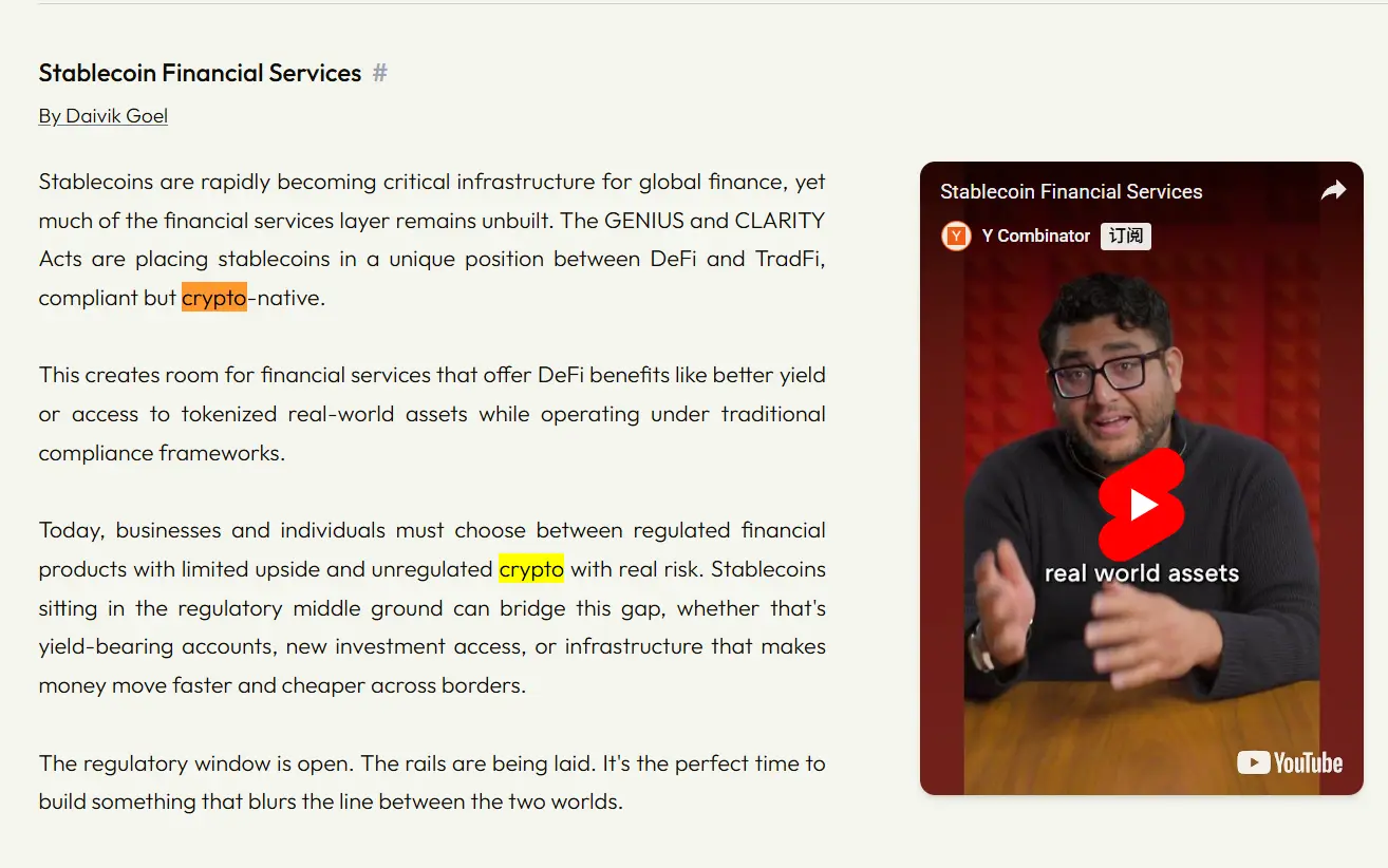 这是YC近两年来第一次在RFS中为Crypto相关方向单独开题。措辞也很具体——不是说"区块链"或"Web3",而是精确到"stablecoin financial services",并给出了具体方向:yield-bearing accounts、tokenized real-world assets、跨境支付基础设施。