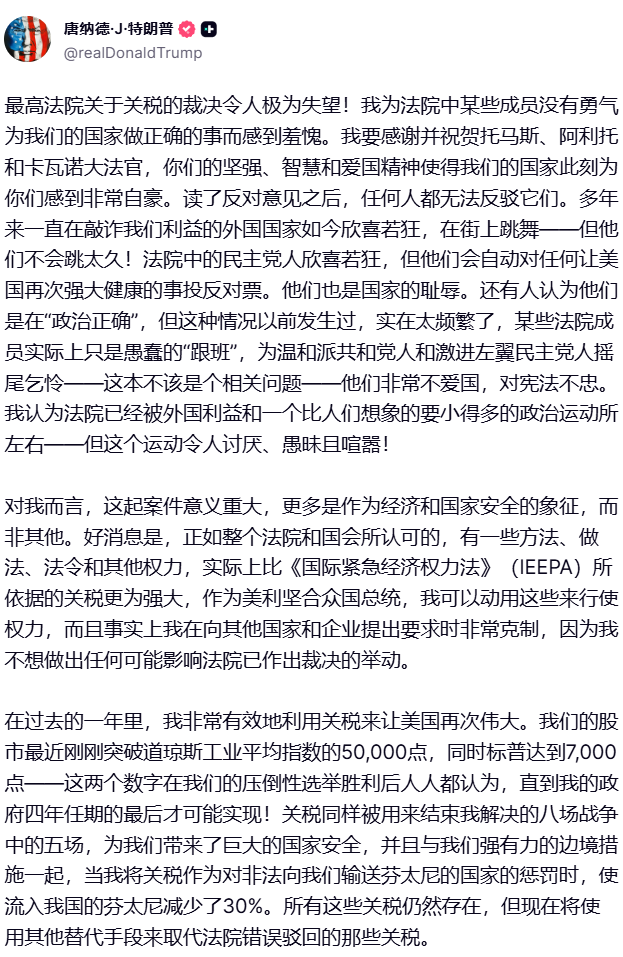 虽然川普的 IEEPA 关税被最高法院判为了非法,但川普政府仍然能引用其它的法案来维护关税,当然这些法案的限制肯定比 IEEPA 要大很多,从时间到范围都会被缩小,对川普来说是头疼,但对于风险市场来说确实是好事,虽然短期会有些波动,但长期从降低通胀和减免一些不确定性要有帮助的。
