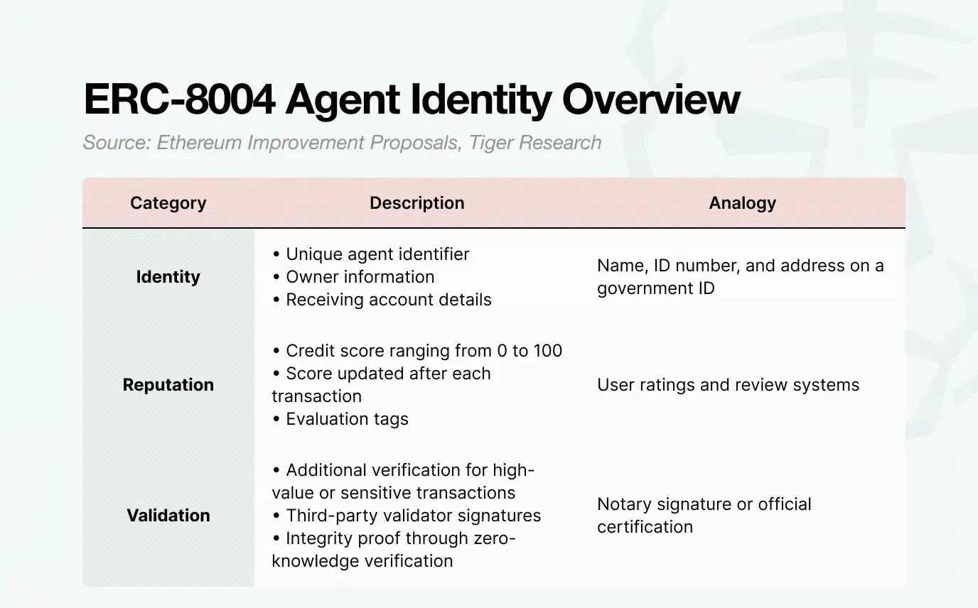 首先是身份层。AI Agent 在区块链上运行必须是可识别的。ERC-8004充当了这一功能。它以NFT 的形式发行,但不是艺术收藏品,而是包含结构化身份数据的凭证 NFT。每个 Token 包含三个部分: