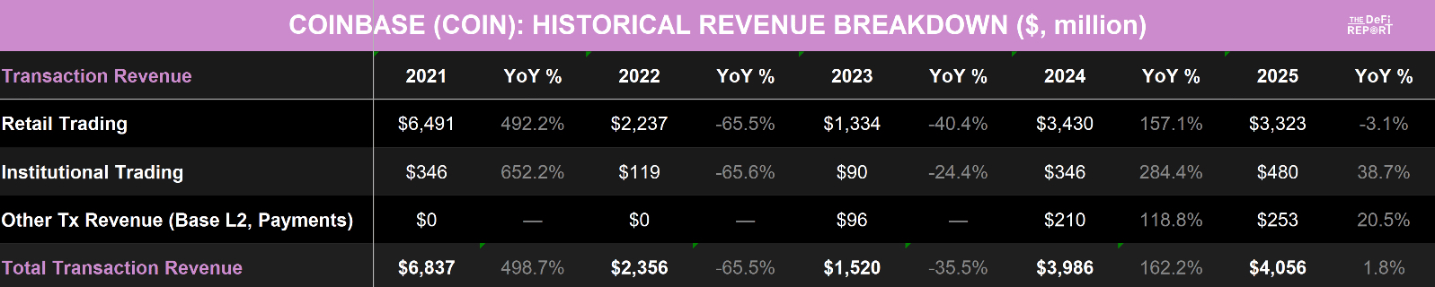 机构交易的份额正在增长。预计到 2025 年,机构交易将占总交易收入的 12%,高于 2021 年的 5%。其他交易收入目前占总交易收入的 6.2%。这主要包括 Base L2 排序器费用和支付收入——这是一个在 2023 年之前并不存在的新项目。