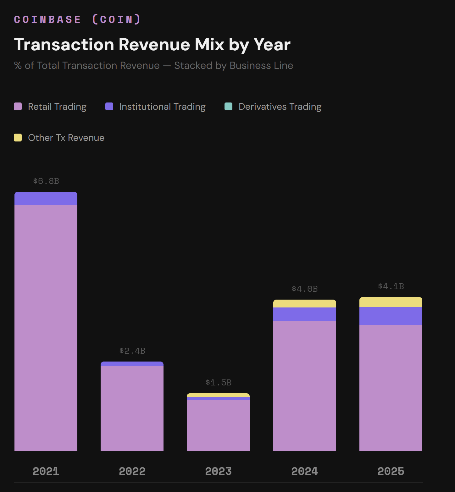 收入结构正变得越来越稳健,且更韧性。2022 年零售交易放缓时,Coinbase 几乎失去了所有收入。如今,收入来源由单一渠道增加到三条,这有助于其在熊市中平滑周期性收入波动。然而,交易收入尚未恢复到 2021 年的水平。事实上,2025 年的交易收入比 2021 年下降了 40%(原因是零售交易收入下降了 48%)。