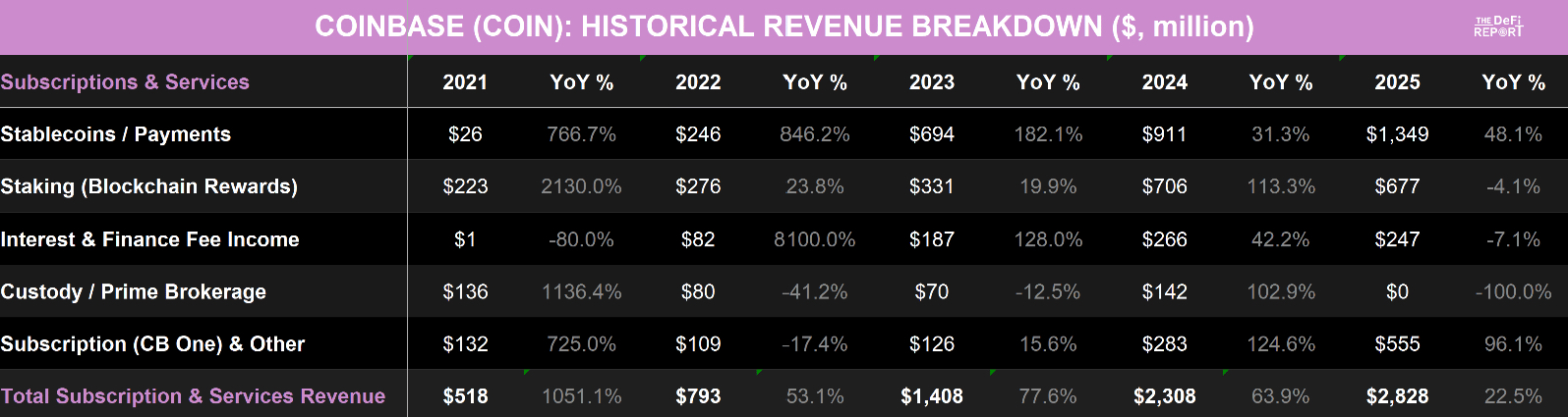 订阅收入(Coinbase One)在 2025 年则增长了 96%,目前占总收入的 7.7%。Coinbase One 当前已拥有超过 100 万订阅用户,产生类似 SaaS 的经常性收入。请注意,从 2025 年开始,托管费用收入已被并入此项。