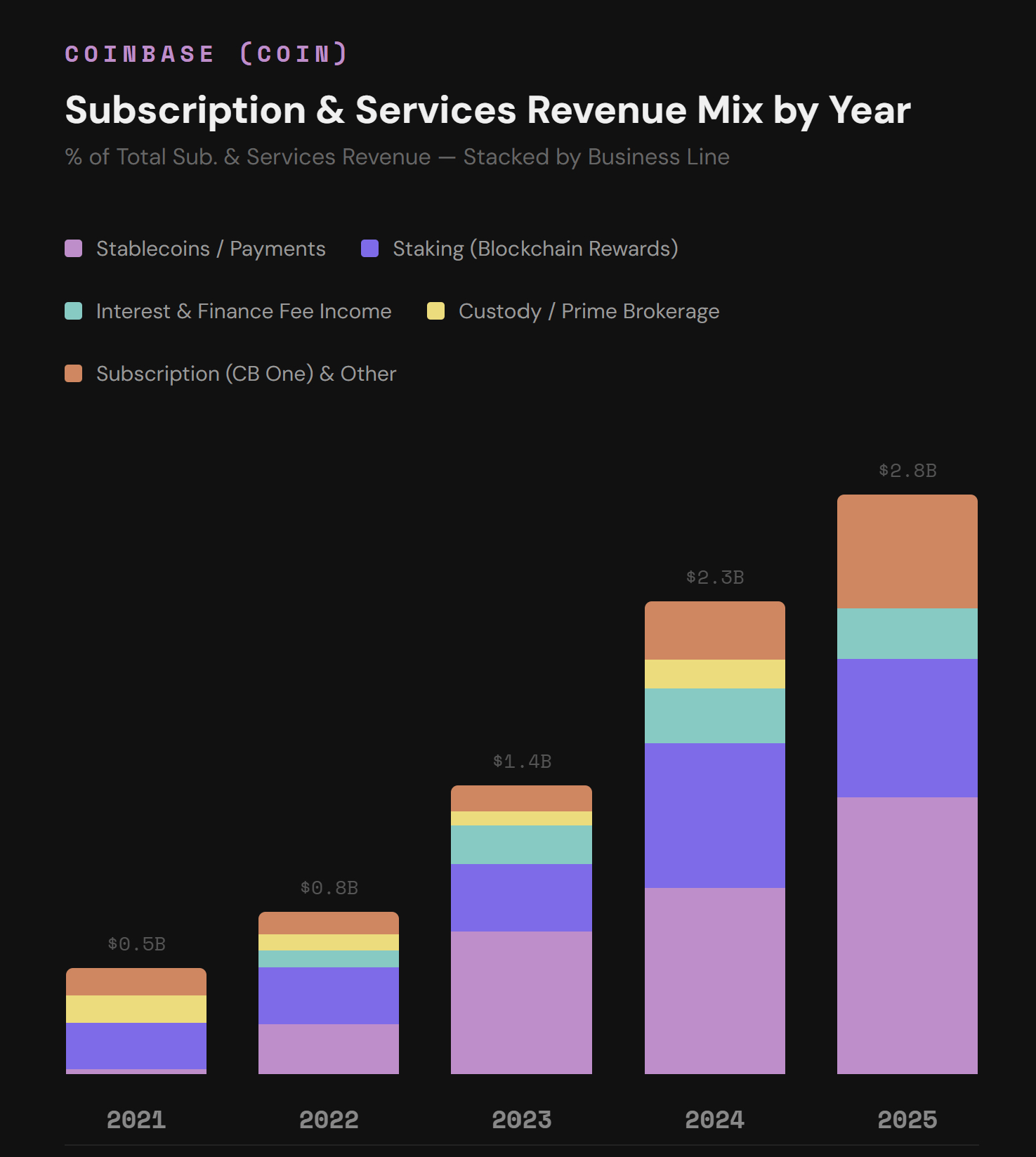 稳定币现在是该板块中最大的单一收入来源,预计到 2025 年将增长至 13.5 亿美元——较 2021 年增长 52 倍,占 2025 年总收入的 19%。这些收入主要来自 Coinbase 与 Circle(USDC)的合作关系。根据合作协议,Coinbase 可获得 Coinbase 平台(包括交易所、Prime 服务和托管服务)上所有 USDC 收入的 100%。此外,Coinbase 还获得平台外所有 USDC 持有量(其他交易所、DeFi、钱包等)「剩余」储备收入的 50%。总而言之,通过这项合作,Coinbase 获得的收入超过了 Circle 总收入的一半。