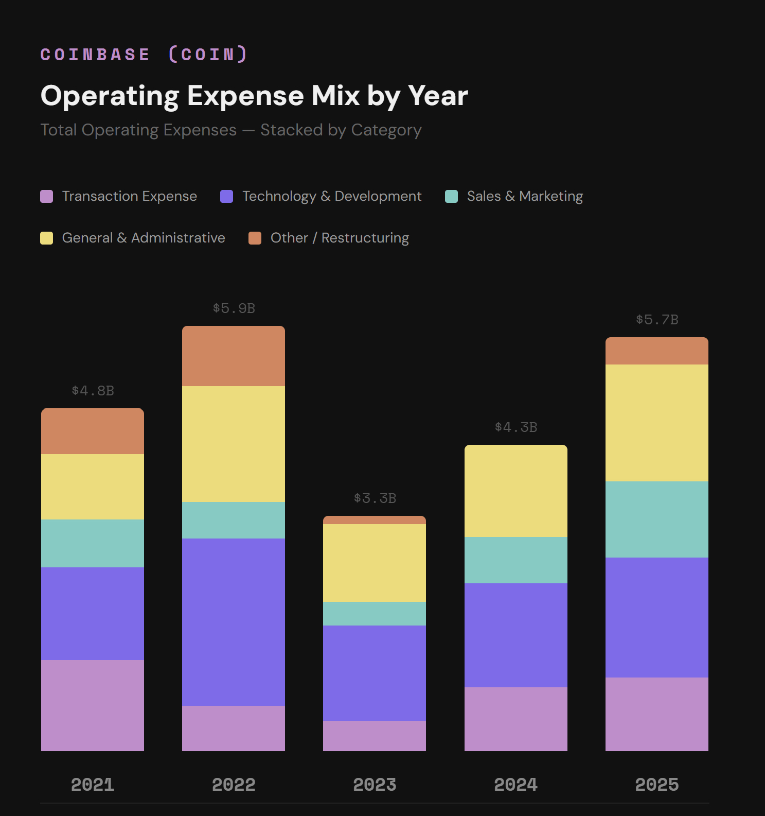 Coinbase 在 2022 年一度濒临破产,当时其运营支出高达 59 亿美元,而营收仅为 32 亿美元。该公司的现金消耗速度惊人,其中技术与开发部门的支出就高达 23 亿美元,而一般管理与行政费用也高达 16 亿美元。