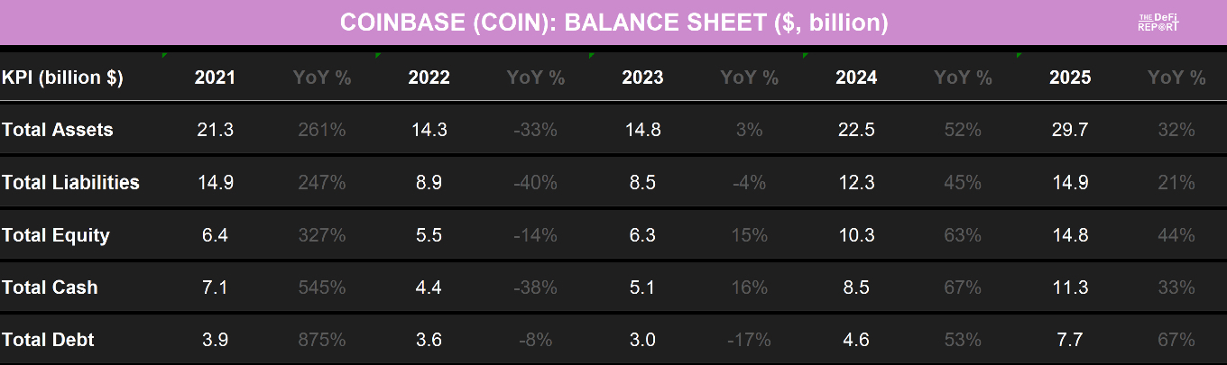 - 资产情况:除现金外(这是其有史以来最大的一项资产),Coinbase 通过收购 Deribit 获得了 42 亿美元的商誉,拥有 20 亿美元的加密货币资产(包括比特币和以太坊),6.23 亿美元的战略投资(其中包括对 Circle 的持股),以及 3.1 亿美元的可交易投资。另有 33 亿美元为运营资产(应收账款、贷款、设备)。2025 年资产负债表上最重大的变化来自于对 Deribit(一家领先的衍生品交易所)的收购。由于此次交易,其商誉从 11 亿美元猛增至 42 亿美元,无形资产也从 4700 万美元飙升至 14 亿美元。