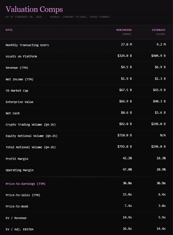 需要注意两点:Coinbase 2025 年的运营支出包括与数据泄露事件相关的 3.45 亿美元,以及数额可观的 Deribit 整合成本,这些成本可以说是非经常性支出。此外,由于营销和获客成本的增加,Robinhood 第四季度的运营支出(与去年同期相比)增长了 38%。总的来说,Robinhood 的成本控制比 Coinbase 更为有效。相对于其收入而言,Robinhood 的运营更为精简。我们认为这主要归因于其业务重点和分销渠道的不同。Robinhood 的目标客户群体是千禧一代和 Z 世代的零售用户。而 Coinbase 则试图同时服务于机构客户和零售客户群体,从而不断拓展产品线,并因此产生了更高的运营费用。