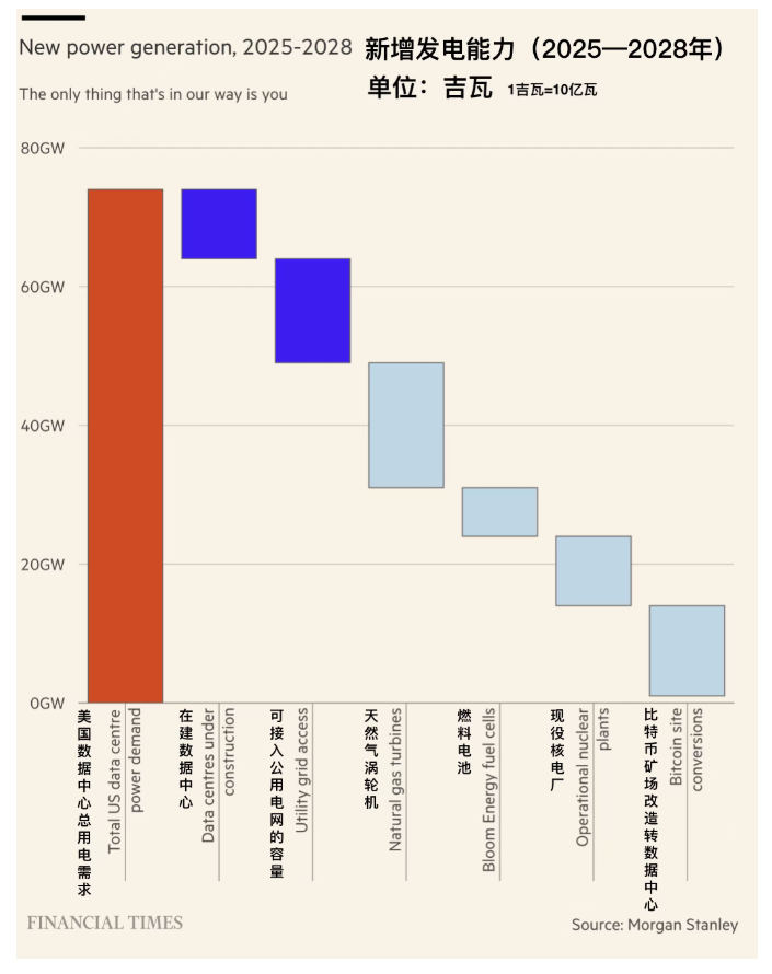 摩根士丹利最近算了一笔账:2025到2028年,美国数据中心的用电需求将增加74吉瓦(1吉瓦=10亿瓦)。但供给呢?正在建的新增基础设施只有10吉瓦,电网能挤出来的可用容量大概15吉瓦,加起来25吉瓦,缺口49吉瓦。