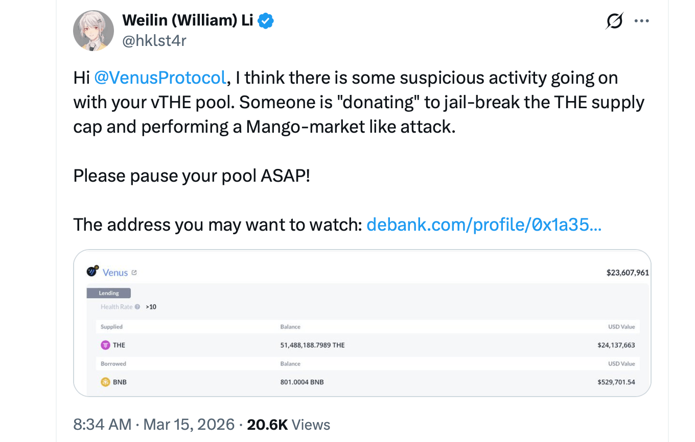 链上和社交媒体警报首次出现在3月15日,当时区块链观察者注意到与钱包地址0x1a35bd28efd46cfc46c2136f878777d69ae16231相关的异常借贷活动,分析师表示该地址向Venus的贷币市场提供了大量$THE代币。该活动很快被标记为潜在的闪电贷或价格操纵式的攻击。