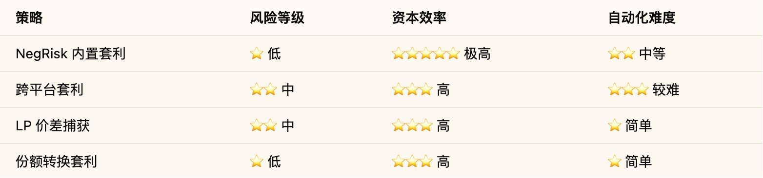 预测市场套利的本质是把市场低效转化为确定性收益。四种策略各有适用场景:
