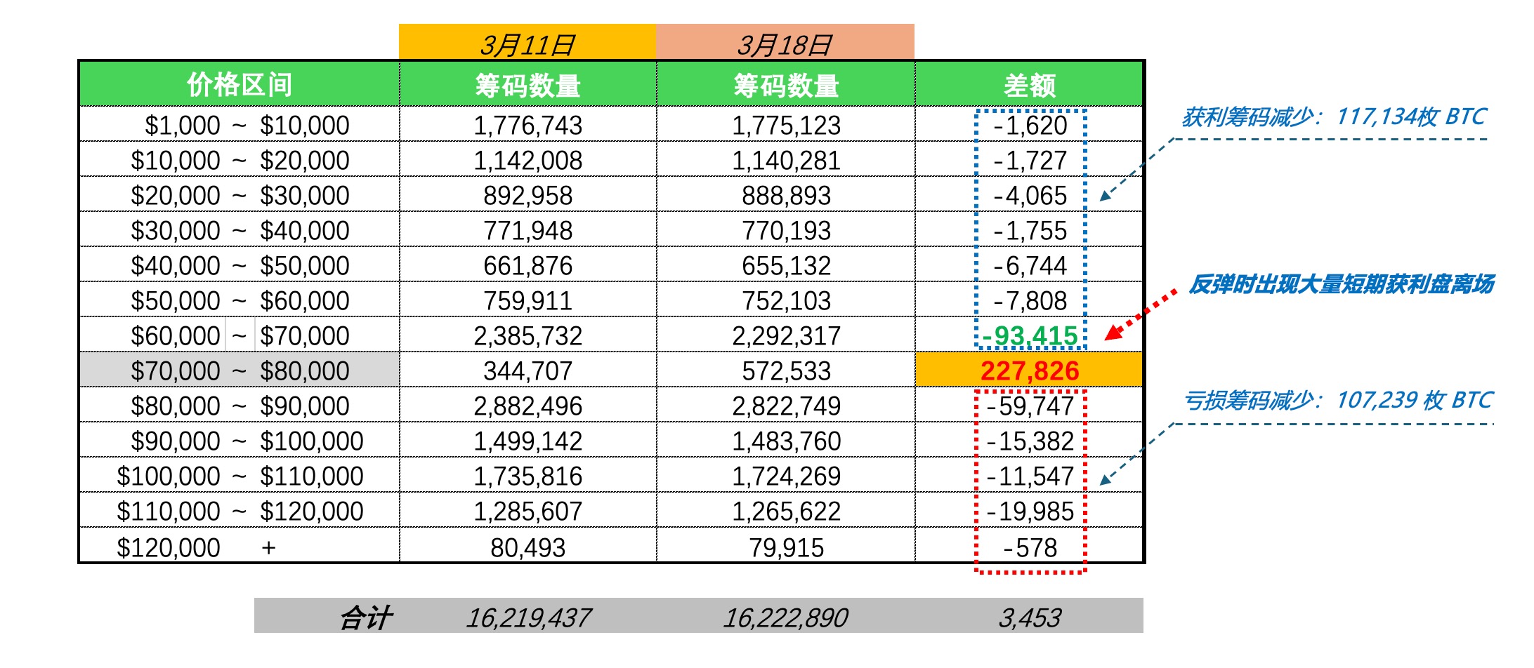 看完宏观层面,我们再从更加微观的角度,观察近 3 周各价格区间内筹码的移动情况,以此来分析市场行为和情绪的变化。