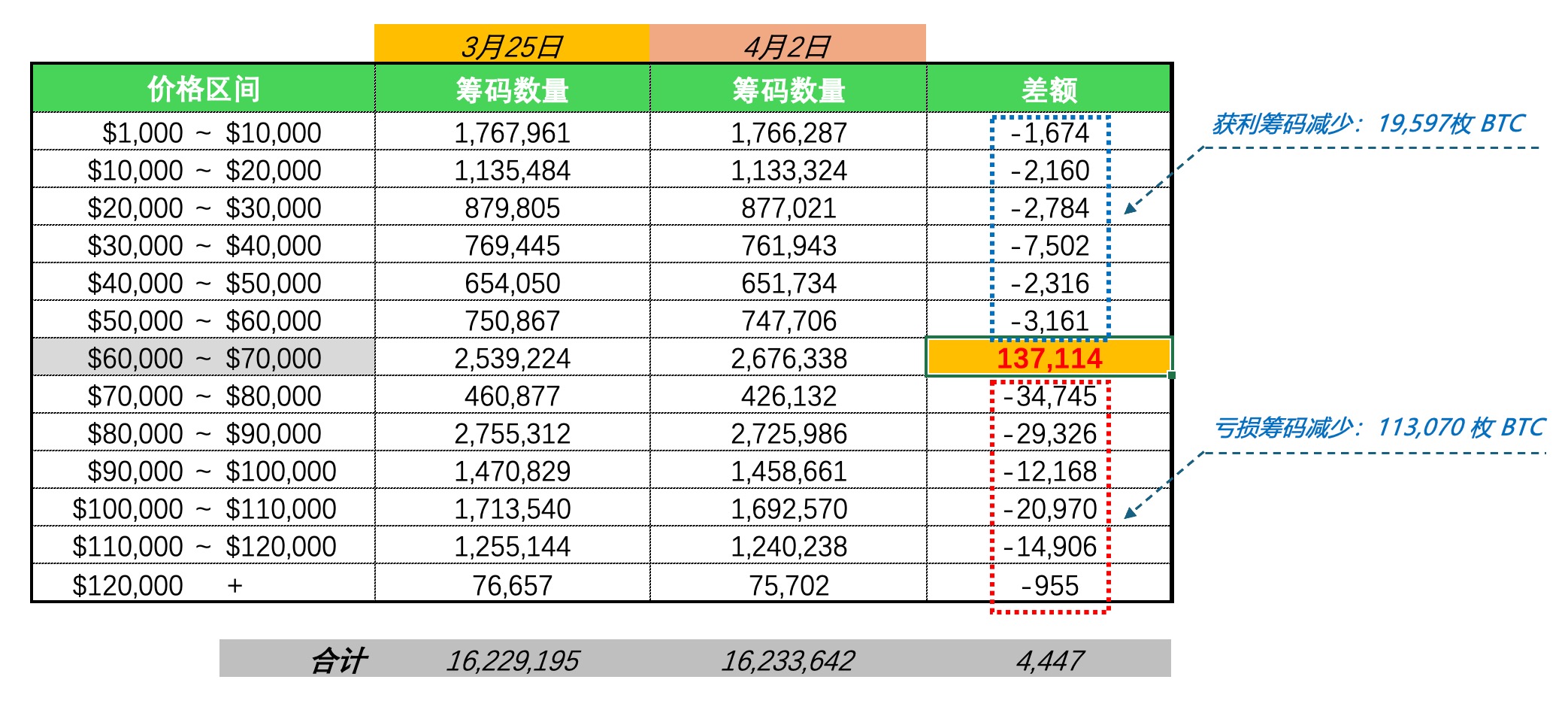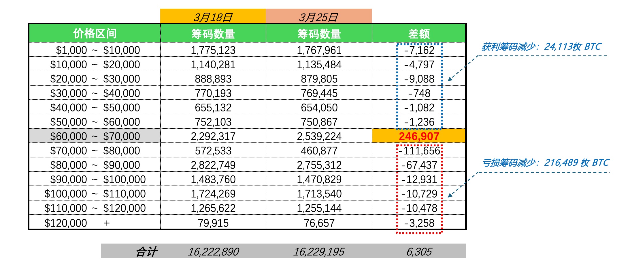 这一周 BTC 价格所在区间为 $60,000~$70,000,在这 7 天内获利筹码减少 24,113 枚;亏损筹码减少 216,489。总换手量为 24.6 w 枚。