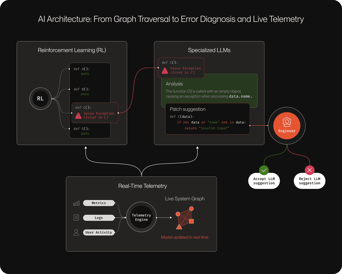 Koratana 训练的模型"真正深入理解代码库,我们理解它们是如何构建的、如何架构的"。他的技术研究企业 bug、问题和解决方案的历史。当出现问题时,他的产品可以"找出原因并修复它,然后从这些错误中学习,防止它们再次发生"。他把自己的产品比作大型代码库的免疫系统。