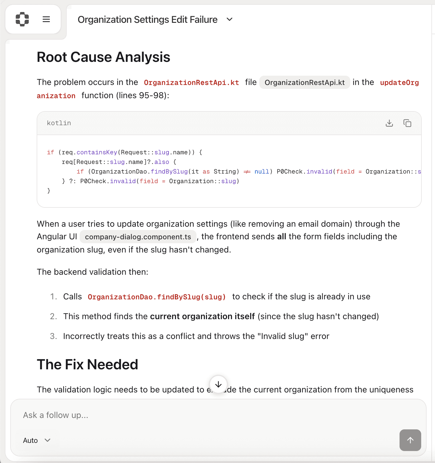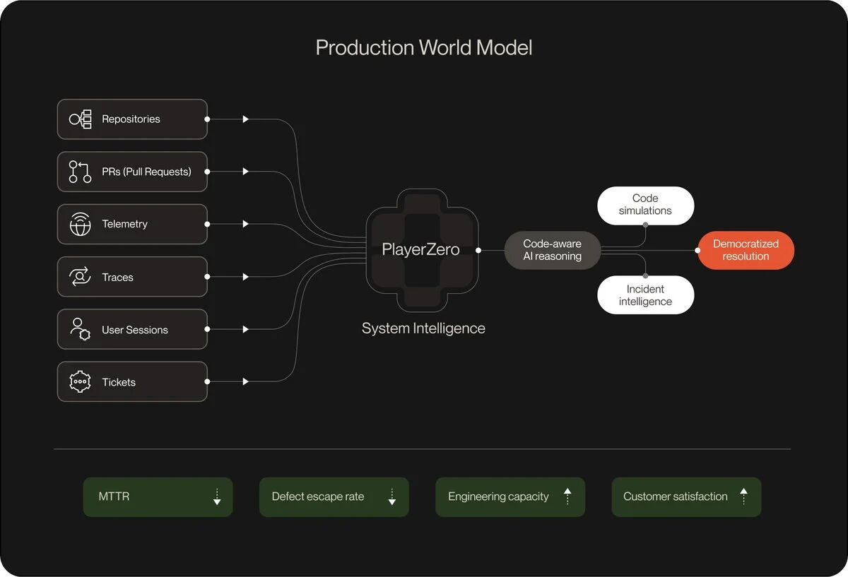 PlayerZero 的核心是他们所谓的 World Model(世界模型),这是一个上下文图,将每次代码更改、可观测性事件、支持工单和过去的事故连接成一个单一的活结构。当 bug 出现时,PlayerZero 将其追溯到确切的代码行,生成修复,并通过 Slack 将其路由给负责的工程师,只需轻触一下即可批准。从检测到修复的循环在几分钟内自主运行。每个已解决的事故都会永久反馈到 World Model 中,因此下次类似代码发布时,系统已经知道上次出了什么问题。