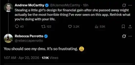 @AJamesMcCarthy 表示,用一个去世小女孩的创意设计牟利是恶劣的行为。Rebecca Perrotto 回复,「这真是太令人沮丧了」