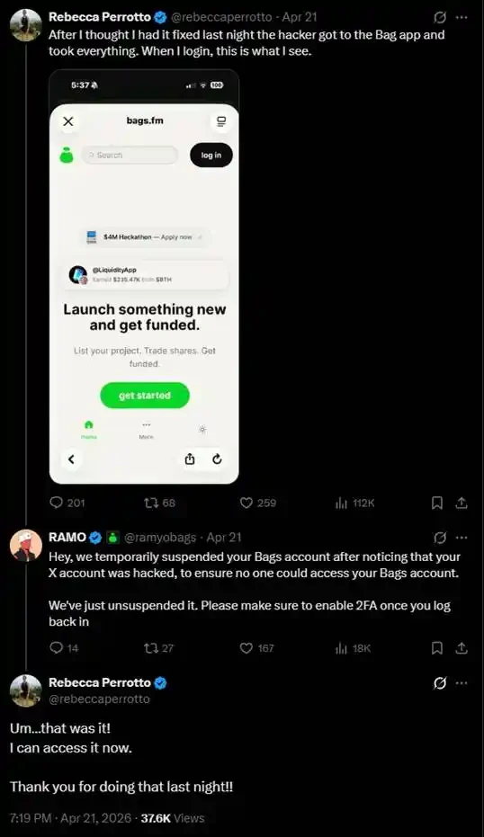 而对于 SOL 上的 $ASTEROID,她能够从中直接获取到手续费收入,且中间可能存在一些沟通。在她的 Bags 账号被盗时,Bags 团队成员也快速进行了响应: