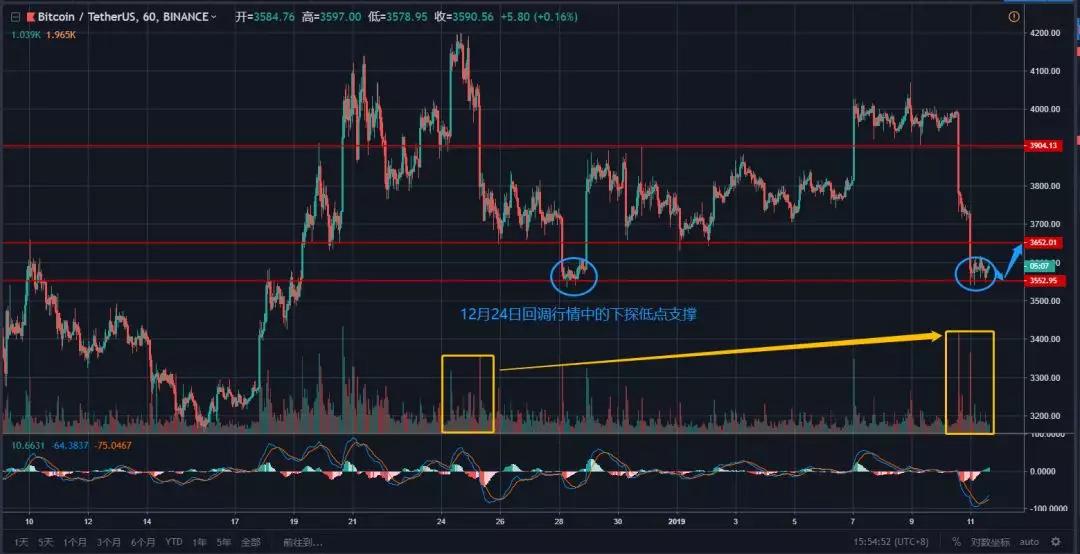 图中红色支撑线条和昨日的分析图中是一模一样的,点位根本没有变化,大家也可看到大饼在两波瀑布之后刚好打到了最后一根支撑上面,也就是上图中画的两个圈圈,这是对应12月28日所产生的底部支撑点位。所以今日如果你问大饼下探完成了吗?大侠可以告诉你下探是完成了,但是情况比预想的要差很多。首先我们昨天也说到这波砸盘是主力的刻意为之,第一根K线放出了巨量,并且所有的主流梯队甚至是山寨公链都出现了巨量砸盘现象,这些不是散户的恐慌所致,而是狗庄的出货行为,而在今日凌晨出现的第二波下探支撑也同样放出巨量,本次砸盘整体的交易量能比12月24-28日这几天的量能都多。所以这波砸下去之后,短时间内再激起市场做多情绪的动能不是很大了,若上图中这两个蓝色的圈圈也在后市被砸破,那么大饼就从回调行情当中演变成了下跌趋势,具体的我们去关注这个画圈的点位,同时也是最后一根趋势线支撑。在砸了两次之后今天理应出现一些反弹,预计反弹压力在3700美元附近,大家可以选择反弹减仓策略,把仓位控制在5成以下,接下来我们可以多以休息为主。