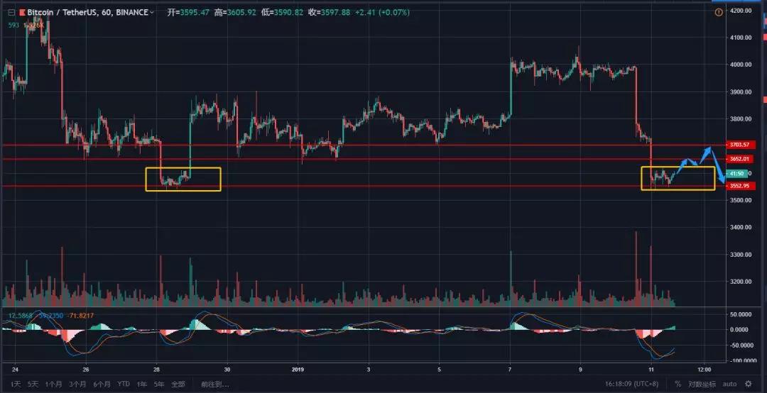 面临大饼突入其来的瀑布日线上直接贯穿所有均线,在3550美元附近多头也做出了最后的防守,但从这波抄底资金的动作来看比较弱小,如此大的成交量也是主力和大户在相继砸盘,所以后市多军重新聚集人气的概率已经很小了。在今日放出巨量之后短期持续下跌的动能慢慢减少,所以短期可以看个小幅反弹,反弹的压力在3700美元附近。若按照我们昨天的分析文章中在3600美元附近加入仓位的可以在反弹之后做一些减仓操作,反弹之后把仓位整体控制在5成以下,因为反弹之后大概率还将继续试探3550美元也就是那两个蓝色圈圈的支撑,若后市跌破这个最后的防线,则单边下跌行情会继续延续。今日整体看震荡反弹,反弹后进入弱势行情的概率较大,建议大家控制仓位注意风险为主,下方支撑3550美元,上方压力3750美元。