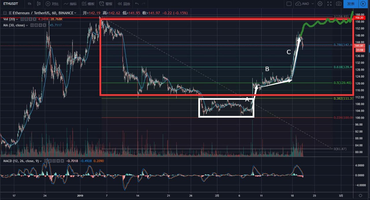 ETH EOS都完成了A B C三浪的拉升,剩下的就只有跌了,当然我们知道一个大浪里面包含了abc小三浪结构,所以你也可以去猜想这个是不是大浪里面的小三浪,从ETH图形来看,红色方框是一个大的黄金坑结构,这样猜想的话ETH还是底部,我们参考其内部小结构可以知道,就算大黄金坑要拉升,也需要在颈线位置作盘整洗筹。